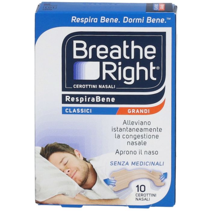 I cerottini nasali Breathe Right, se correttamente applicati sulla superficie del naso, attraverso una semplice azione meccanica e senza l'ausilio di medicinali, permettono immediatamente di respirare meglio. Ogni cerottino nasale è infatti costituito da strisce flessibili che sollevano delicatamente i passaggi nasali offrendo: - un sollievo immediato dalla congestione nasale a causa del raffreddore comune o del raffreddore allergico, - una migliore respirazione per le persone con setto nasale deviato, - una riduzione del russamento, migliorando la qualità del sonno. Dispositivo Medico CE.