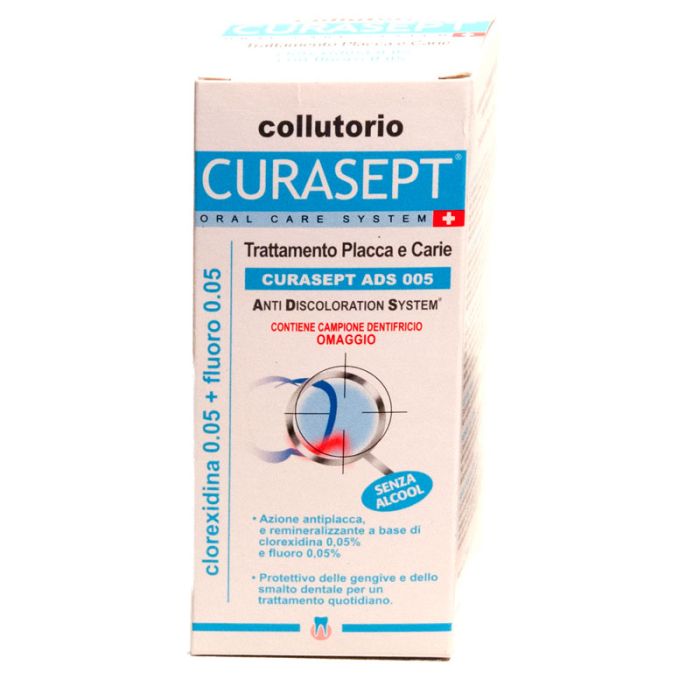 Trattamento placca e carie, remineralizzante. Protegge le gengive e lo smalto dentale. Indicato ai portatori di apparecchi ortodontici e a chi è più soggetto a carie. Remineralizza lo smalto dentale impedendone la demineralizzazione e aumenta la resistenza alla carie, inibendo gli enzimi dei batteri. Curasept è l'unica linea completa di prodotti a base di Clorexidina con A.D.S. (Anti Discoloration System), l'innovativo sistema brevettato e testato clinicamente che riduce drasticamente la comparsa di macchie giallo-brune principale effetto collaterale della Clorexidina.