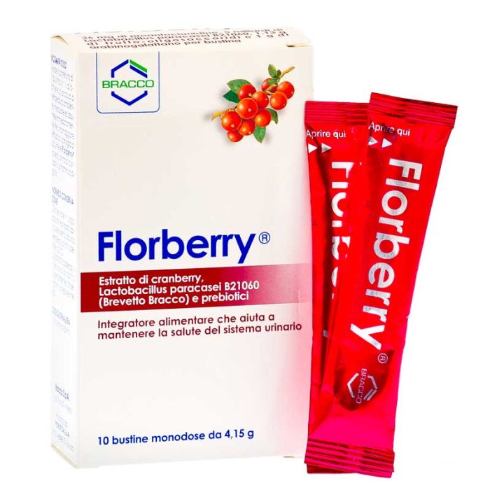 Florberry® è un integratore alimentare formulato con mirtillo rosso (cranberry), Lactobacillus paracasei e prebiotico.