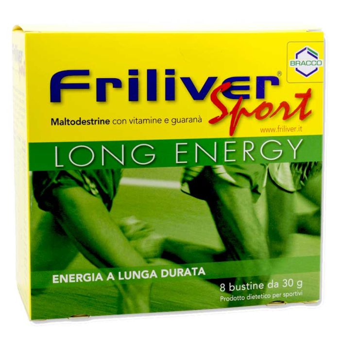 Integratore alimentare di maltodestrine con vitamine e guaranà. Le maltodestrine contenute in Friliver Sport Long Energy, sono carboidrati facilmente solubili in acqua che risultano digeribili senza difficoltà, al contrario dei carboidrati complessi derivati dagli alimenti come pasta, pane e riso. L'assunzione di maltodestrine durante un allenamento o una gara di lunga durata, garantisce un apporto costante e continuo di energia mantenendo relativamente stabile la glicemia. Questa caratteristica, fondamentale per chi pratica sport di resistenza, non è riscontrabile negli zuccheri semplici come il saccarosio (zucchero da cucina). Questi ultimi, infatti, vengono assimilati e bruciati dal corpo facendo aumentare la glicemia in maniera rapida (picco glicemico) per poi esaurire il loro effetto in breve tempo. Prodotto dietetico per sportivi con zucchero.