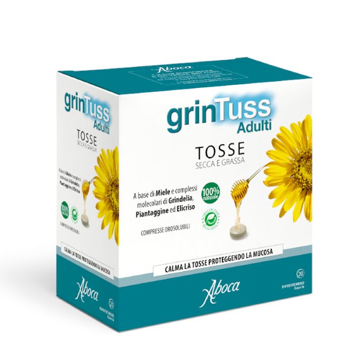 Grintuss è un prodotto a base di miele e complessi molecolari che svolge un'azione protettiva e di conseguenza lenitiva delle prime vie aeree. Agisce sulla tosse secca contrastando l’irritazione della mucosa e sulla tosse grassa favorendo l’idratazione e l’eliminazione del muco. Grintuss adulti compresse è realizzato mediante innovativi processi di estrazione e produzione che consentono di concentrare le frazioni polisaccaridiche, resinoidi e flavonoidiche responsabili dell’azione mucoadesiva e protettiva della mucosa. Il Miele presente nella formulazione contribuisce a questa attività e al gusto gradevole delle compresse.