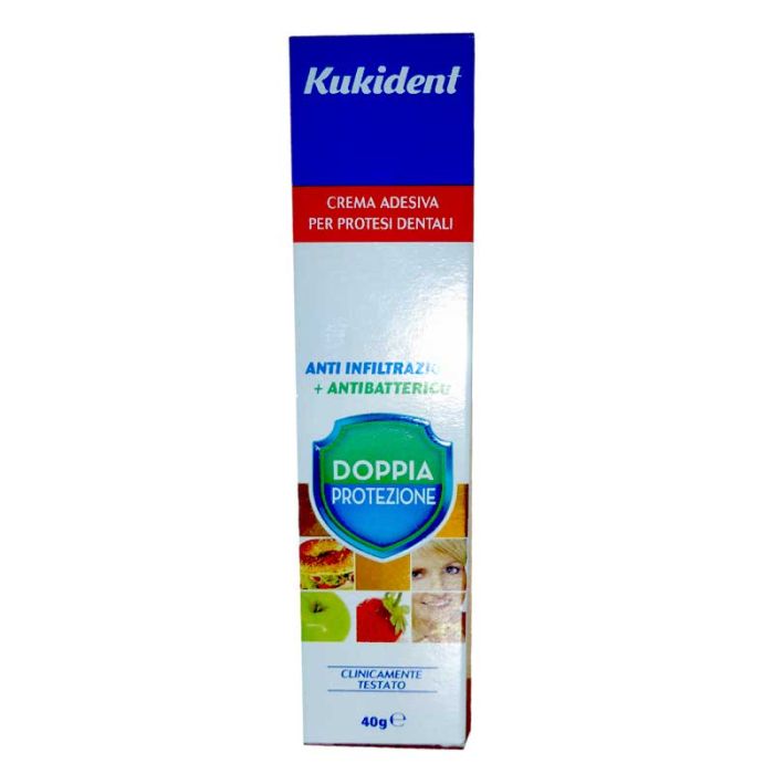 Combina un'ottima tenuta con una protezione della bocca clinicamente testata contro batteri e particelle di cibo fastidiosi. Il beccuccio ultra sottile consente un'applicazione controllata e continua che crea una barriera costante che impedisce alle particelle di cibo di penetrare. Grazie alla modalità di applicazione facilitata Doppia Protezione è appositamente progettato per coloro che non hanno mai utilizzato un adesivo per dentiera. L'azione antibatterica riduce la proliferazione batterica senza danneggiare la flora naturale della bocca. Inoltre contiene un maggiore livello di mentolo che però non altera il gusto del cibo e delle bevande.