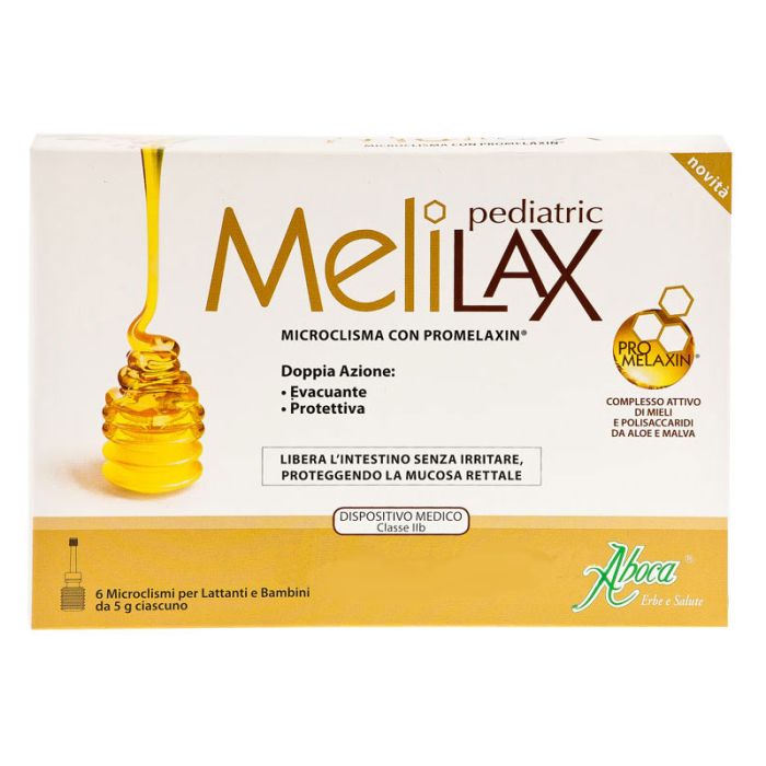 La doppia azione di Melilax e' ottenuta grazie a Promelaxin, un complesso di mieli di nettare e di melata appositamente selezionati e lavorati in base al loro contenuto di monosaccaridi, polisaccaridi e melanoidine, arricchito con la frazione polisaccaridica da Aloe e Malva. Melilax Pediatric esplica un'azione evacuante che induce uno stimolo di attivazione della defecazione.
