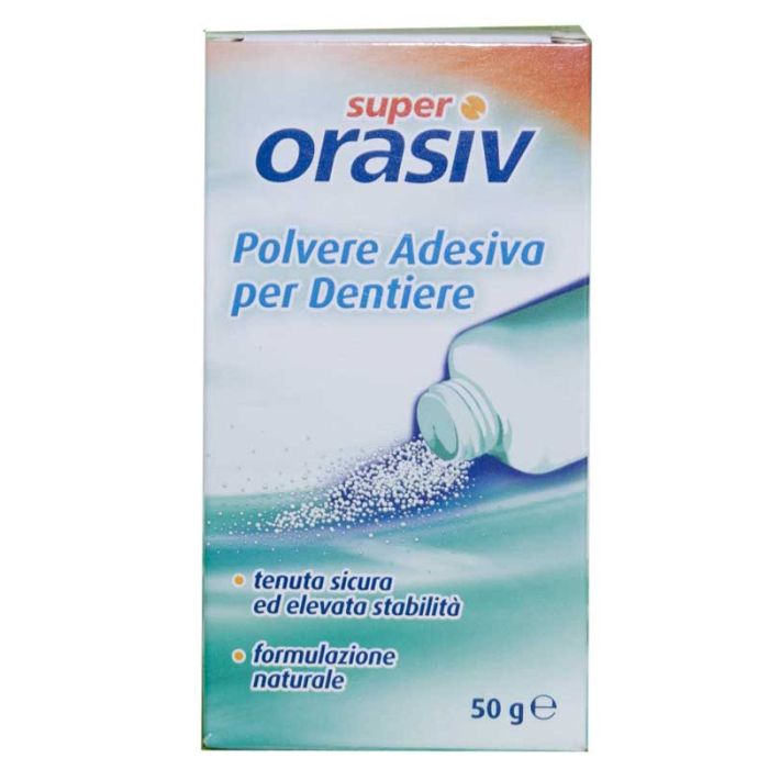 pulire accuratamente la dentiera. Sciacquare la protesi. Togliere l'eccesso di acqua e, quando la protesi e' ancora umida, spargere con moderazione uno strato sottile ed uniforme di Orasiv polvere sulle superfici che vanno a contatto con palato e gengive.Posizionare correttamente la protesi in bocca, premendo per alcuni secondi. Tenere al riparo dall'umidità.