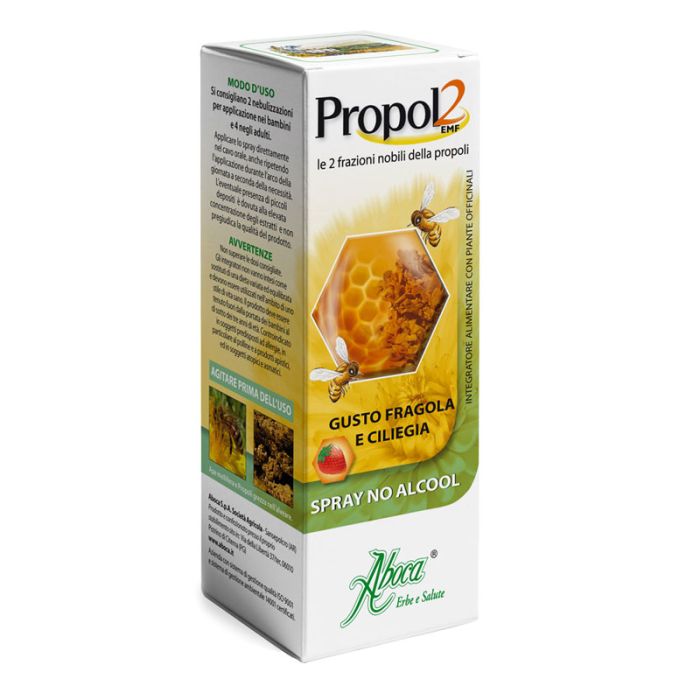 Propol2 EMF è un estratto multifrazione, ottenuto per estrazione e frazionamento, che seleziona le 2 frazioni nobili della Propoli: Flavonoidi (Pinocembrina e Galangina) e CAPE (estere feniletilico dell'acido caffeico, caratteristico della Propoli). Si eliminano così quelle sostanze indesiderate che determinano la formazione di filamenti solidi e depositi scuri non graditi. L'estratto liofilizzato Propol2 EMF, grazie all'elevata solubilità in acqua delle sue sostanze funzionali, permette di sfruttare al meglio le proprietà della Propoli. La pratica confezione con nebulizzatore no-gas permette un utilizzo facile e mirato, consentendo di ripetere l'applicazione più volte nell'arco della giornata.
