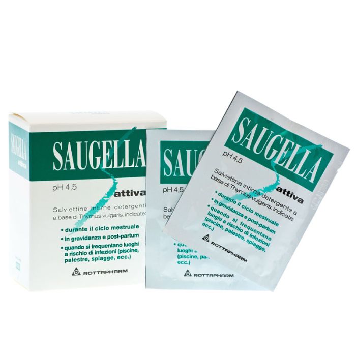 Imbevute di una soluzione di Saugella Attiva detergente a base di estratto di timo. Garantiscono una efficace igiene intima anche fuori casa. sono particolarmente indicate durante il ciclo mestruale, in gravidanza e nel post-partum, quando si frequentano luoghi a rischio di infezioni come piscine, palestre, spiagge, in viaggio, ecc. L'uso delle salviettine è consigliato anche in caso di lieve incontinenza urinaria, per contrastare la comparsa di odori sgradevoli.