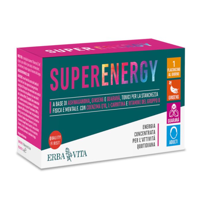 Acqua, Miele d’Acacia, sciroppo d’Agave, Mirtillo nero (Vaccinium myrtillus L.) frutto succo concentrato, L-Carnitina tartrato, Acetil L-Carnitina cloridrato, Olivello spinoso (Elaeagnus rhamnoides (L.) A.Nelson) frutto polvere, Guaranà (Paullinia cupana Kunth) semi estratto secco, titolato al 10% in caffeina; Ginseng rosso (Panax ginseng C.A. Meyer) radice estratto secco, titolato al 20% in ginsenosidi; Ashwagandha (Withania somnifera (L.) Dunal.) radice e parte aerea estratto secco, titolato al 10% in withanolidi; Maca (Lepidium meyenii Walp.) radice estratto secco, titolato al 2.5% in β-ecdysone; aroma arancio, conservante: potassio sorbato; maltodestrine, addensante: gomma xantana; Niacinamide (Vit. B3), Calcio pantotenato (Vit. B5), Coenzima Q10 (Ubidecarenone), Riboflavina (Vit. B2), Piridossina cloridrato (Vit. B6), Tiamina cloridrato (Vit. B1), Acido pteroil-monoglutammico (Acido folico o Vit. B9), Cianocobalamina (Vit. B12).Quantitativi per dose giornaliera consigliata (1 flaconcino): Mirtillo nero frutto succo concentrato 600 mg; Olivello spinoso frutto polvere 250 mg; Guaranà semi e.s. 200 mg (caffeina 20 mg); Ashwagandha radice e parte aerea e.s. 100 mg (withanolidi 10 mg); Ginseng radice e.s. 100 mg (ginsenosidi 20 mg); Maca radice e.s. 30 mg (β-ecdysone 0.75 mg); L-Carnitina tartrato Acetil L-Carnitina cloridrato pari a L-Carnitina totale 500 mg; Coenzima Q10 5 mg; Tiamina (Vit. B1) 1.1 mg (100% NRV*); Riboflavina (Vit. B2) 1.4 mg (100% NRV*); Niacina (Vit. B3) 16 mg (100% NRV*); Acido pantotenico (Vit. B5) 6 mg (100% NRV*); Vitamina B6 1.4 mg (100% NRV*); Acido folico (Vit. B9) 200 μg (100% NRV*); Vitamina B12 2.5 μg (100% NRV*). *NRV: valore nutritivo di riferimento giornaliero.